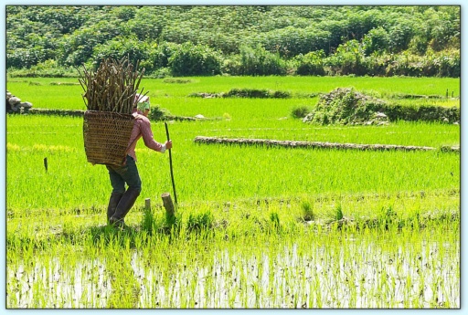 | | On me fait essayé le travail dans la rizière. Une dame me prête ses bottes et sa faucille. |